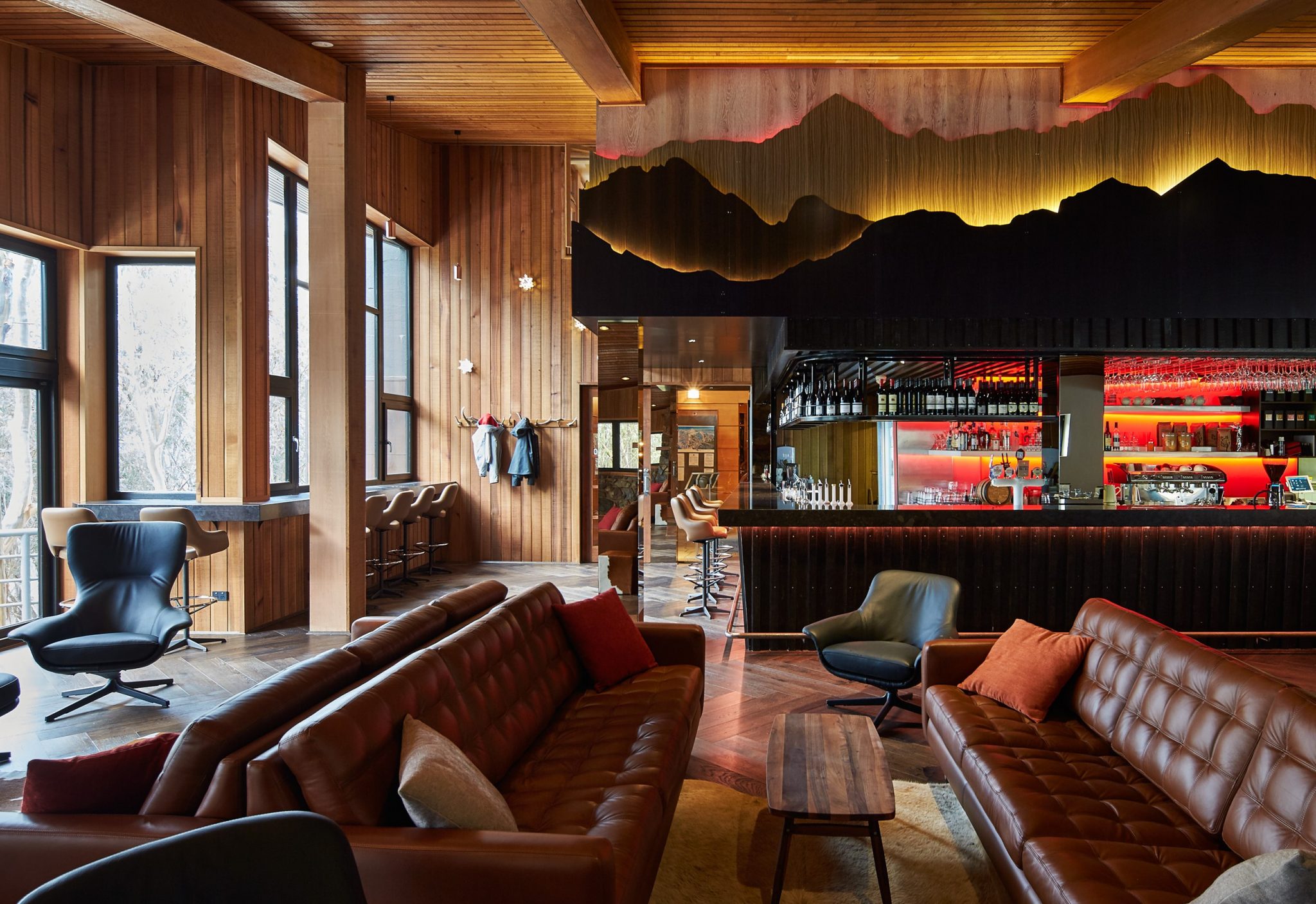 Grant Amon Architects have achieved a simplistic and stylish European alpine look complete with leather, timber, stone and tiles all locally sourced and ecofriendly. Rooms come complete with mountain views with interior touches that have been hand-sourced from around the world with a keen eye for detail.