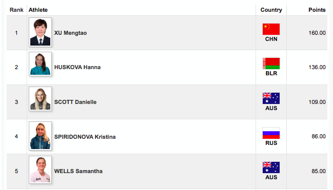 Scott who started the season as World #2 scored 100.11, beating the current World #1 from China, Mengtao Xu who scored 87.42 for silver and Kristina Spiridonova from Russia on 86.94 for third place. It was a close score for the top five with Aussie, Samantha Wells taking fifth place with 86.36, a mere .58 away from bronze.