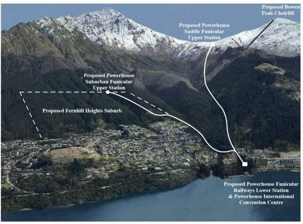 The Bowen Peak ski field with a six seater chair and the Powerhouse Precinct “village” with conference facilities for 1500 people would then be connected by two funicular railways.